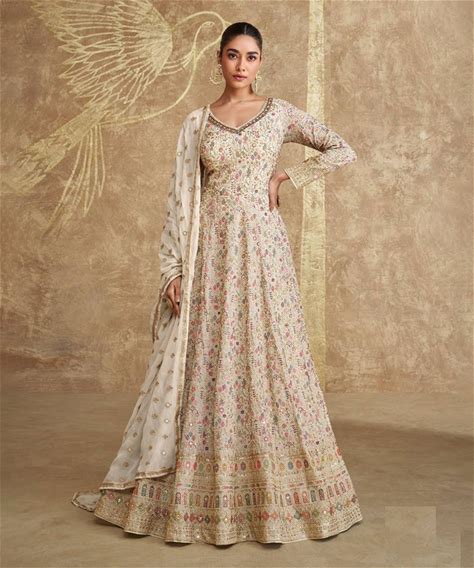 Beige Embroidered Georgette Free Size Stitched Anarkali Suit - Semi-Stitched-Salwar-Suits